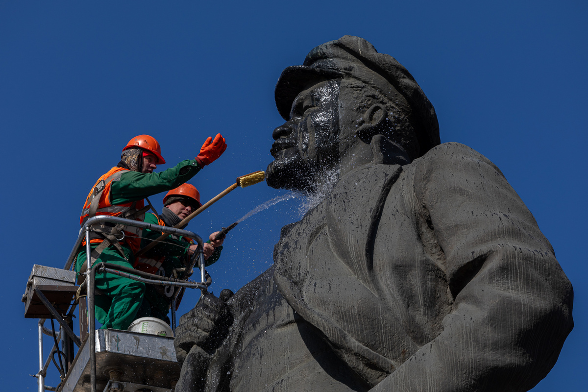 В Красноярске помыли главный городской памятник. Времена меняются – а традиции остаются: когда подходит день рождения Ильича – а родился он 22 апреля, сюда приезжает автовышка, поднимает рабочих – и те щетками с пеной и мощной струей воды счищают со статуи накопившуюся за год пыль и грязь. Вода – непременно теплая, а моющее средство специальное, щадящее, которое не нанесет урона металлу. За час-полтора уходит 5-6 кубометров воды. Ильич преображается, из серого временно становится антрацитово-черным – блестит под солнцем. Ну, а когда влага испаряется, монумент кажется новым, словно вот-вот приехал из мастерской скульптора.