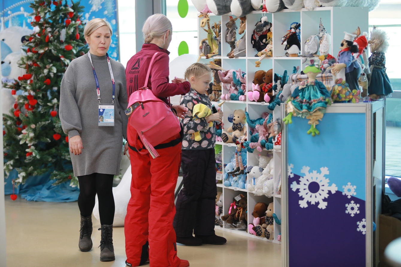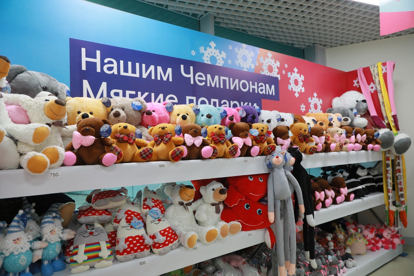 Большие витрины под названием «Мягкие игрушки чемпионам» предлагают свой товар от 150 до 7000 рублей.