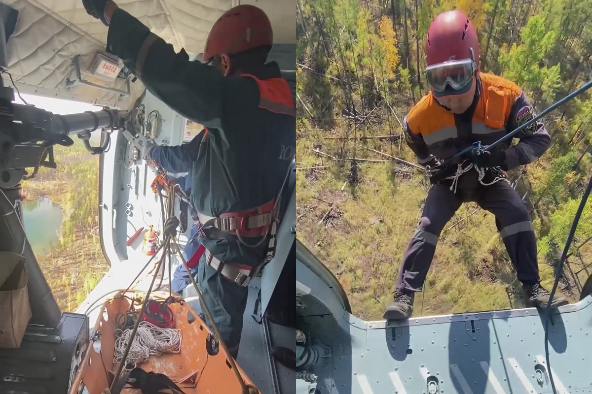 Мужчину обнаружили быстро – он находился на редколесье. Но вот проблема – посадить вертолет вблизи нет возможности, деревья не позволят это сделать. И тогда решено было применить способ беспарашютного десантирования.
