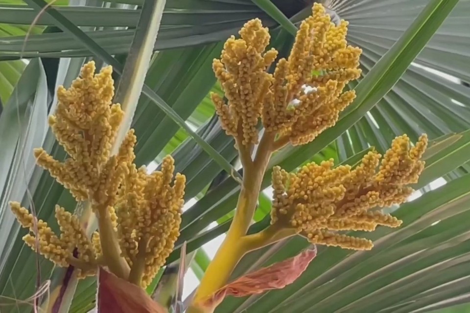 — Сейчас соцветия только набирают цвет. Скоро эти кукурузные зернышки превратятся в небольшие цветочки. Пальмы цветут не каждый год. Из 141 пальмы в этом году зацвели только 6. После цветения в искусственной среде плодов не образуется.