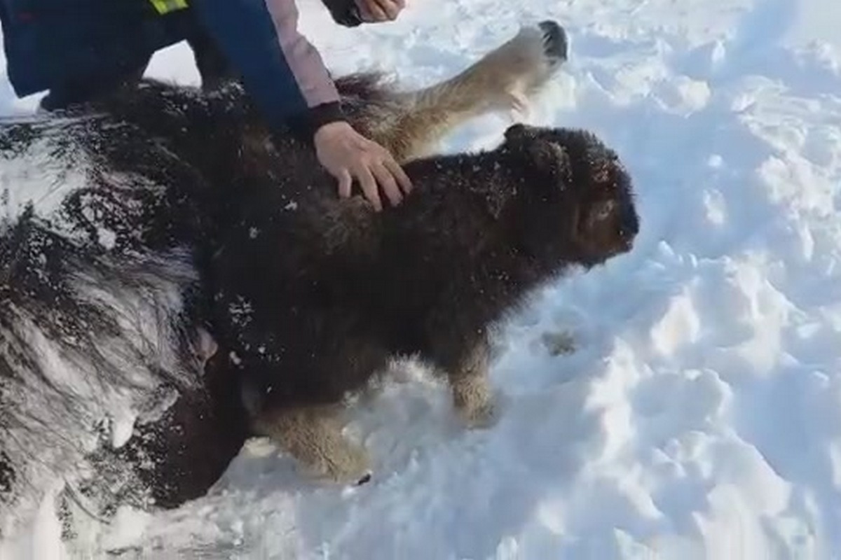 Но маленькому овцебыку улыбнулась удача: по зимнику проезжали люди. Сотрудники компании, добывающей алмазы, обратили внимание на нечто черное, лежащее среди белоснежного поля. И когда решили проверить – нашли кроху. Он немного испугался, даже пытался спрятаться за матерью. Но силенок нет, едва стоит на ногах, даже позволил себя погладить человеку.