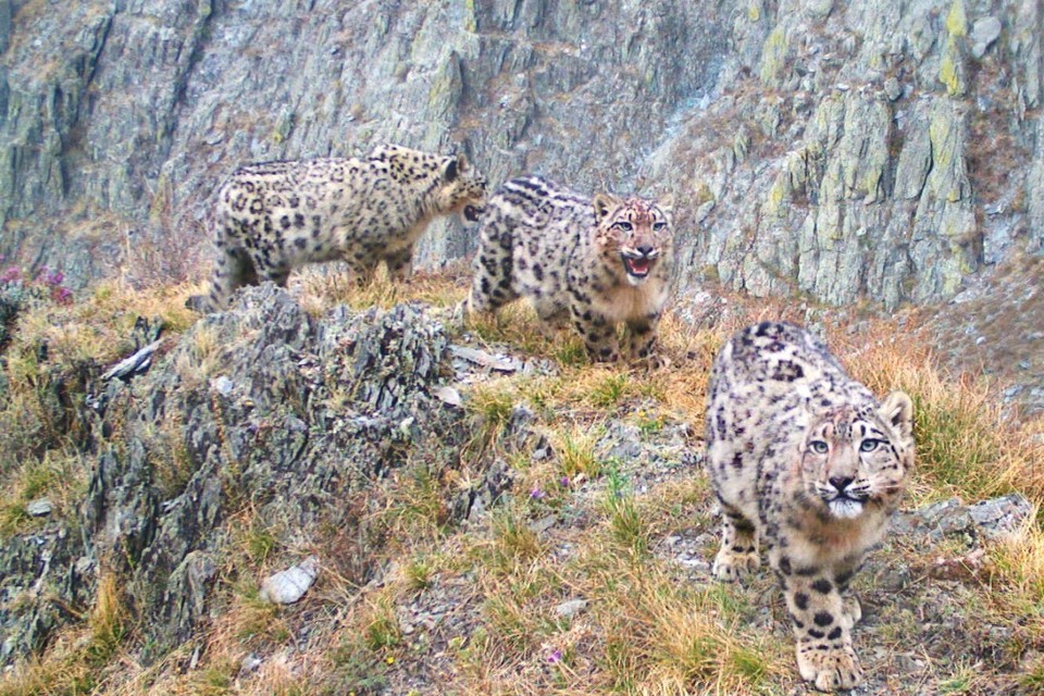 В Саянский горах фотоловушка сняла семью снежных барсов