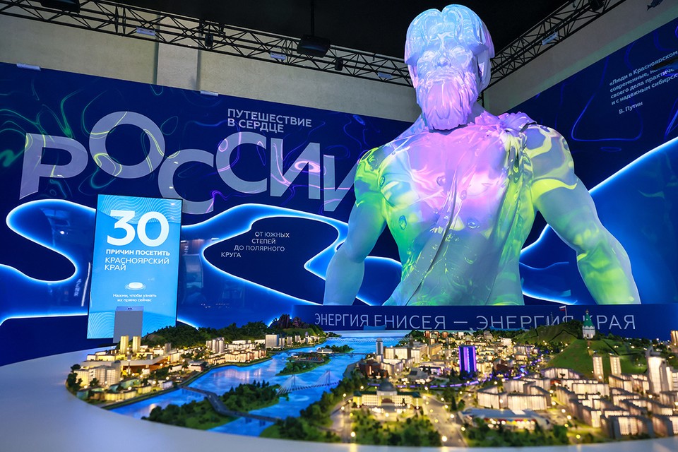 Главная достопримечательность экспозиции — пятиметровая скульптура Енисея. Она олицетворяет природное достояние края. Образ могучей сибирской реки в виде сильного мужчины с бородой сгенерировал искусственный интеллект. Благодаря современным технологиями — это не просто скульптура, а полноценный гид. Он рассказывает посетителям выставки о Красноярском крае. Также раз в час люди видят и световое представление. Отметим, что скульптура весит около тонны.