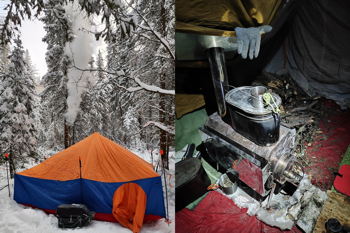 Задолго до темноты туристы установили палатку, печку, заготовили дрова. Грамотно организованный ночлег и дежурство у печки – вот внутри палатки всю ночь комфортная температура: от +5 до +15 градусов. Был один неприятный момент, около 3 часов ночи, когда температура в жилище опустилась до -7. Оказывается, печка забилась углем. С проблемой опытные туристы справились быстро: вытащили на улицу, вытрясли, вернули на место и снова затопили.