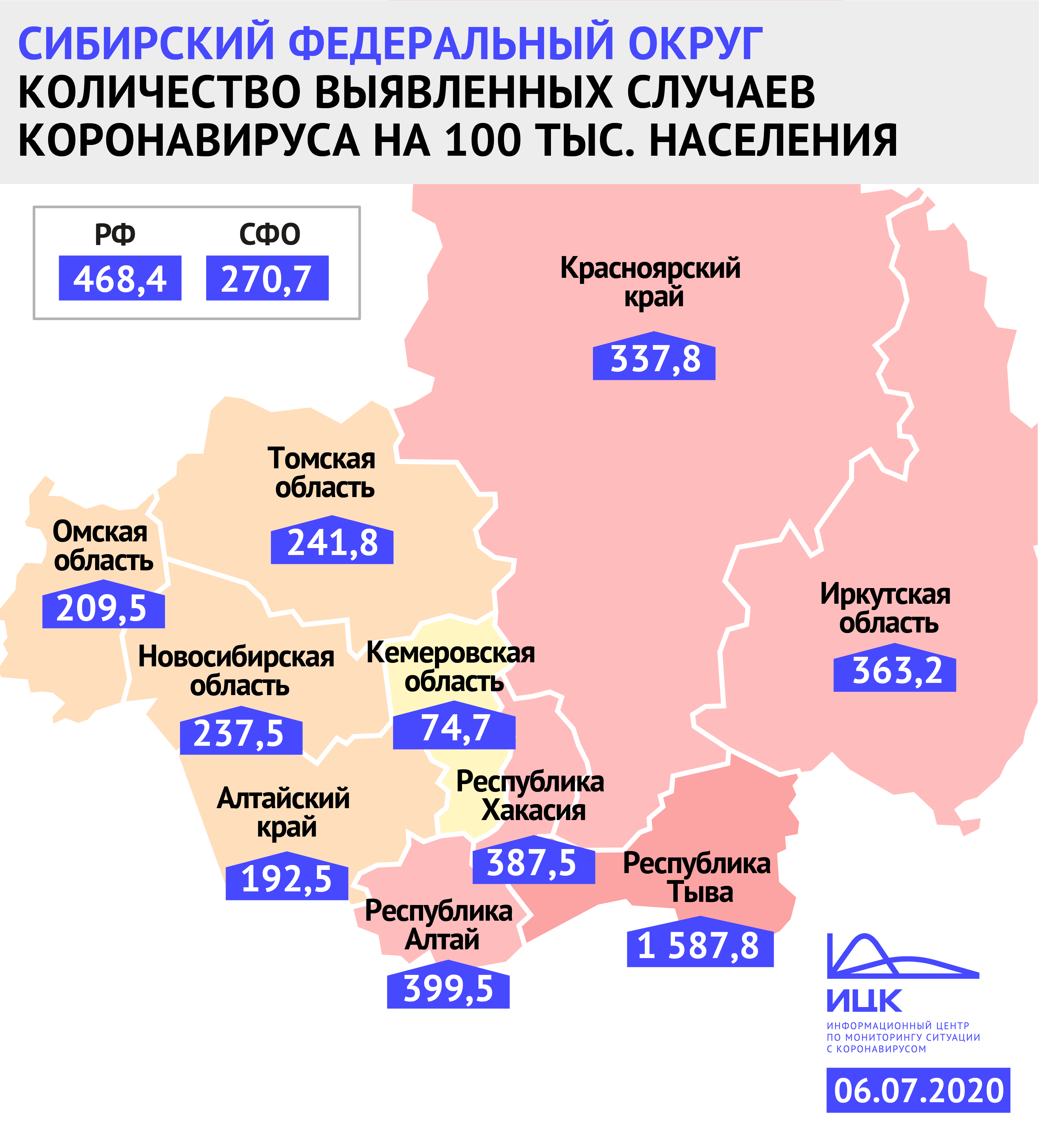 Распространённость эпидемии в Красноярском крае от недели к неделе увеличивается медленнее. Самый высокий показатель — первый в рейтинге СФО и второй по РФ — в Республике Тыва, стремительный недельный рост показала Республика Алтай, она вышла на второе место в СФО по распространённости коронавируса среди жителей, сместив на третье Хакасию. Самый низкий показатель в СФО по-прежнему дает Кемеровская область.