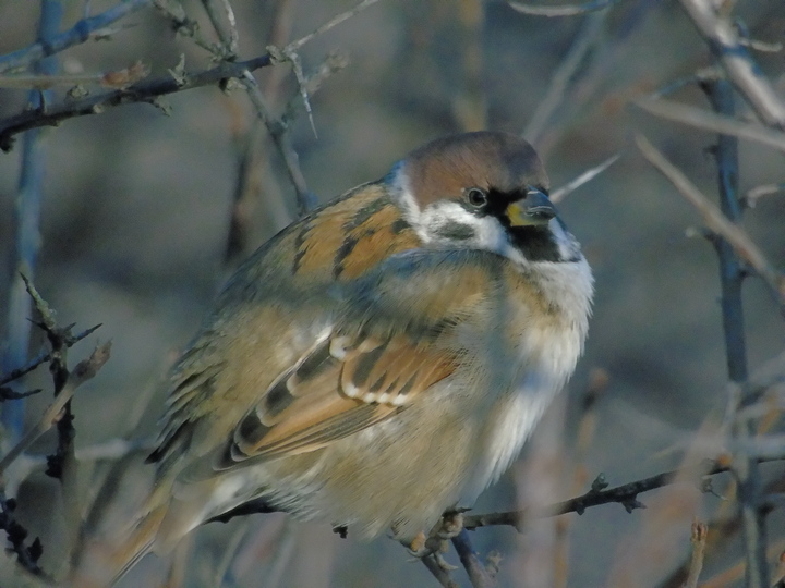 Главное отличие полевого от городского родственника – отсутствие полового диморфизма. Самки и самцы в одинаковых шоколадных шапочках. Из-за этой особенности получили народное название красноголовые. На каждой щечке у воробушков черная отметина. Чуть ниже клюва — небольшой чёрный галстучек.