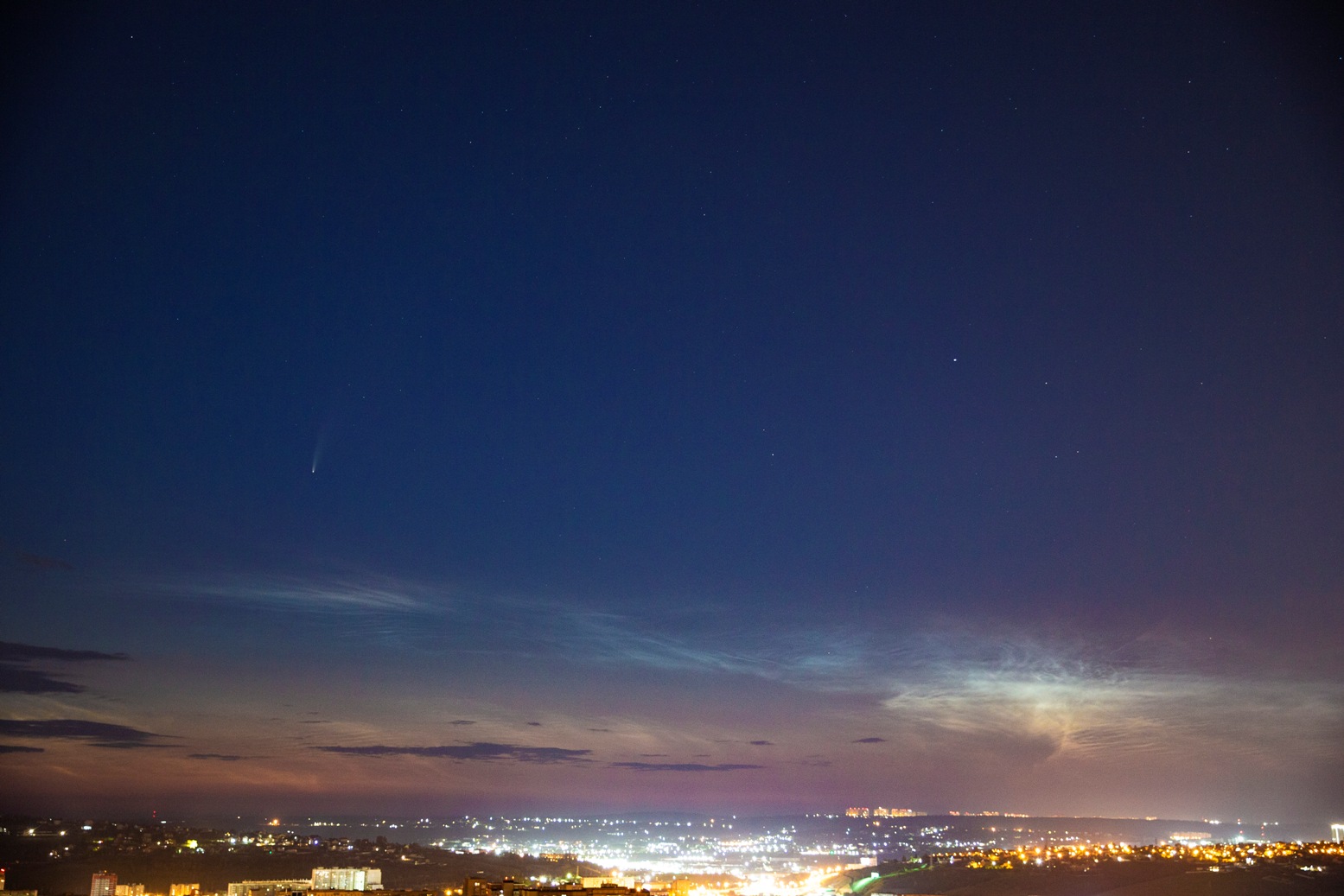 — Все лето с семьей отдыхаю на Беле в Хакасии — путешествуем на трейлере. Телескоп вожу с собой. Слышал давно, что она пролетать будет, но вчера увидел своими глазами. Собирался спать уже ложиться, смотрю — летит. Достал телескоп. Дети соседские (мои уже спали) в восторге были, — рассказал фотограф Сергей Сошенко. — Зрелище, конечно, завораживающее.