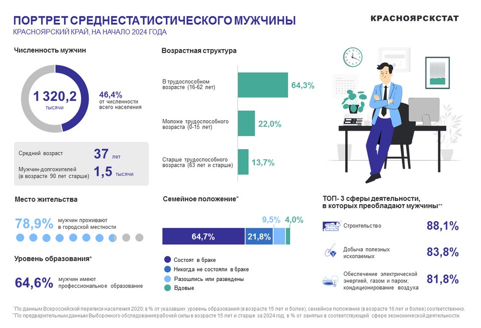 Перед 23 февраля специалисты Красноярскстата составили среднестатистический портрет мужчины, проживающего в регионах Енисейской Сибири — Красноярском крае, Хакасии и Туве. Эксперты проанализировали численность, возраст, данные о браках и работе на начало 2024 года.