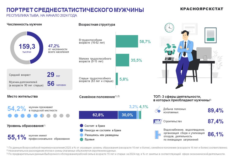 Средний возраст мужчины в Туве — 29 лет. В регионе проживает 159,3 тысячи мужчин — это 47,2% от общего населения. Женаты 62,8%, никогда не состояли в браке — 30%, разведены — 3,2%, вдовцы — 4,1%.